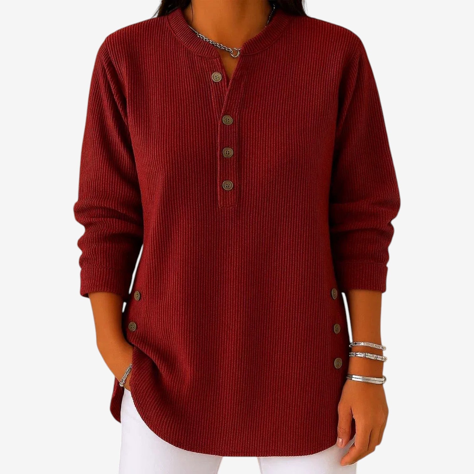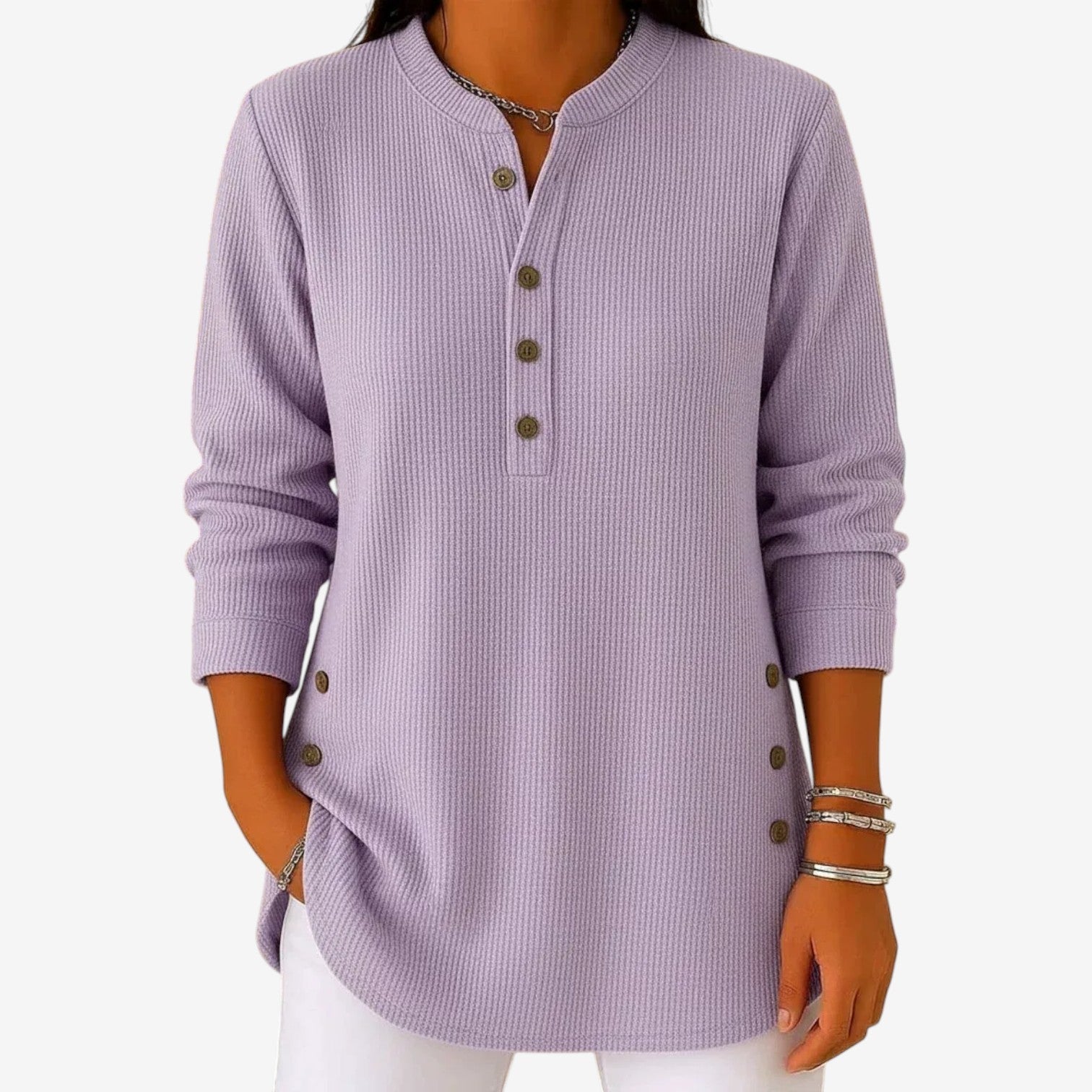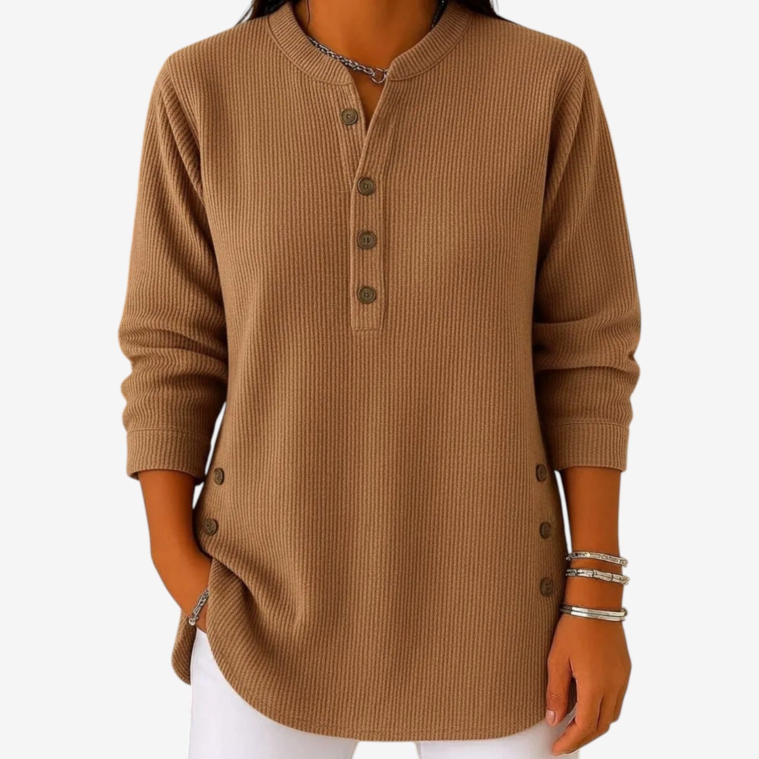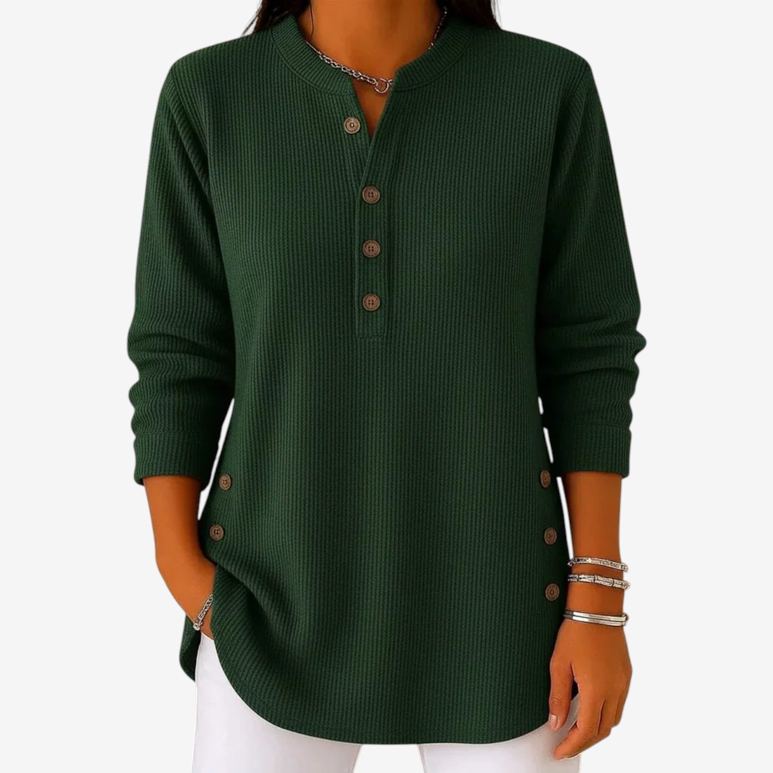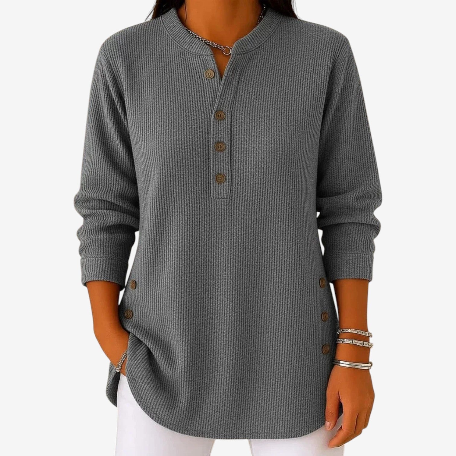 Un capo essenziale e disinvolto, caratterizzato da una calma sicurezza e da un fascino discreto. Questa blusa morbida e fluida presenta una scollatura pulita con delicati dettagli abbottonati, creando una silhouette rilassata ma al tempo stesso raffinata. Il tessuto leggero cade in modo naturale, offrendo comfort senza rinunciare all'eleganza. Un capo essenziale e versatile, pensato per adattarsi senza problemi alle mattine tranquille e ai pomeriggi più composti.
